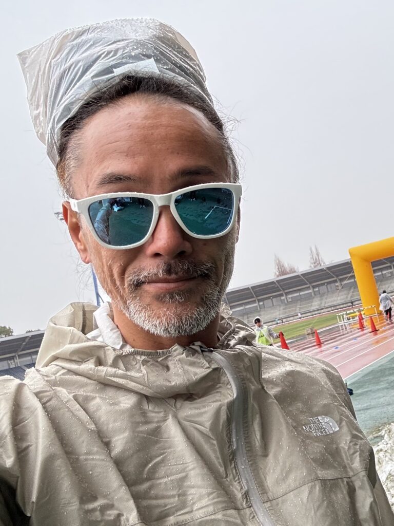 マラソン大会当日に雨が降ったときはコンビニ袋をドレッドにかぶせて走っています。最近では子ども用のシャワーキャップがちょうどよいので導入しました。