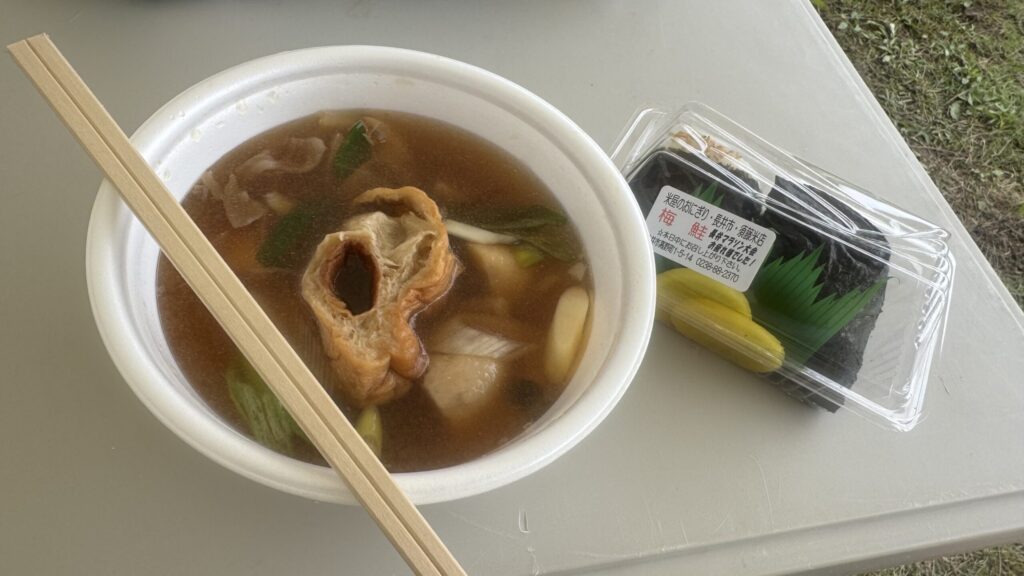 こちらは牛肉が入った醤油ベースのいも煮とおにぎりが2つ。