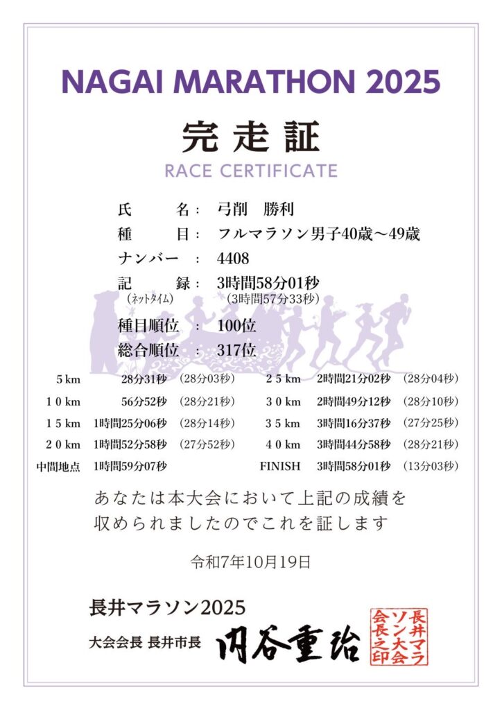 【長井マラソン】ついに念願のサブ4に返り咲き!フル3:57:33
